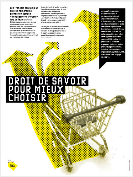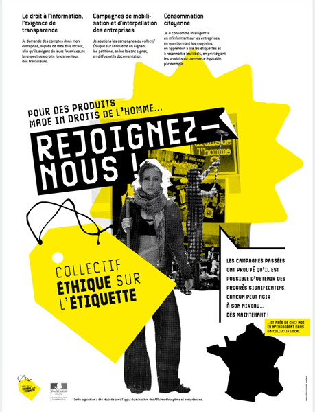 Le slogan de l'affiche est intitulé "mondialiser les droits humains au travail". Les plaquettes de présentation expliquent les conditions dans lesquelles sont fabriqués vêtements, chaussures de sport, jouets ainsi que la responsabilité des entreprises et l'information des consommateurs.