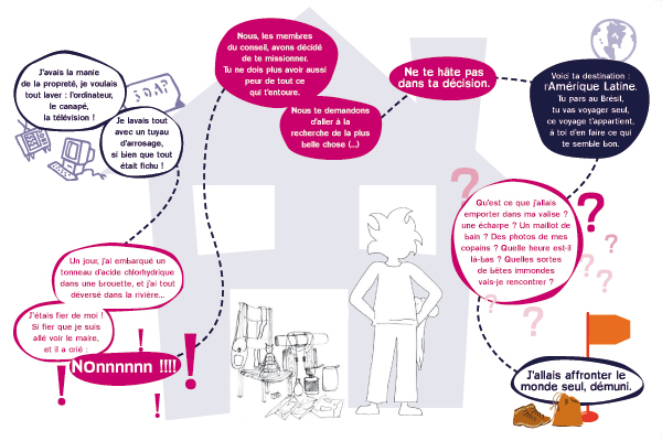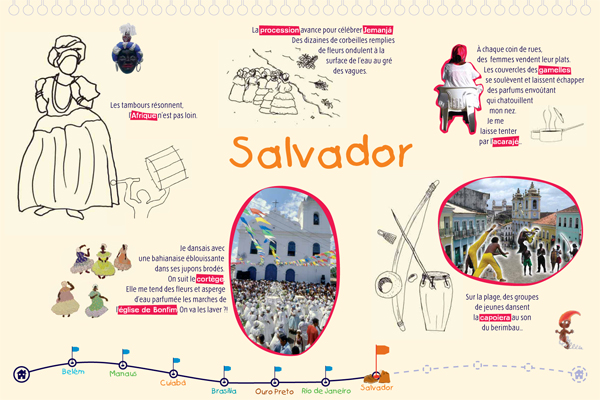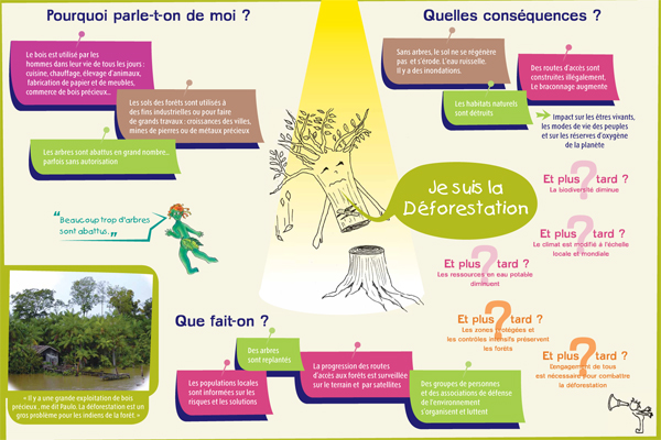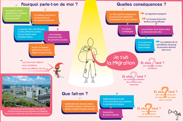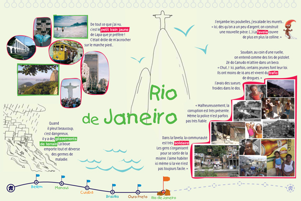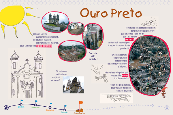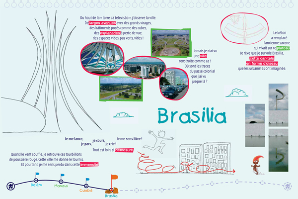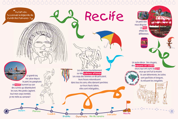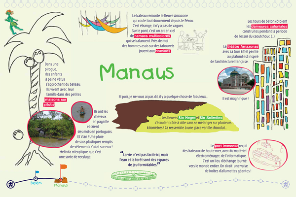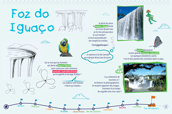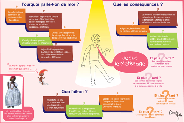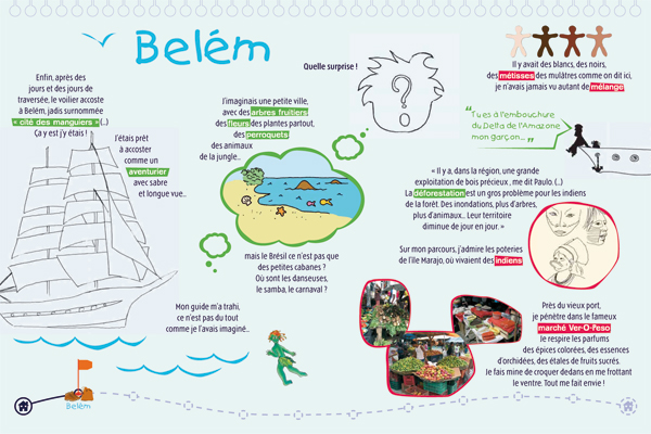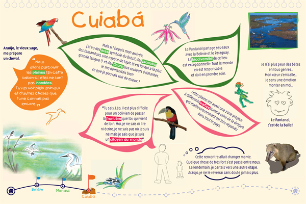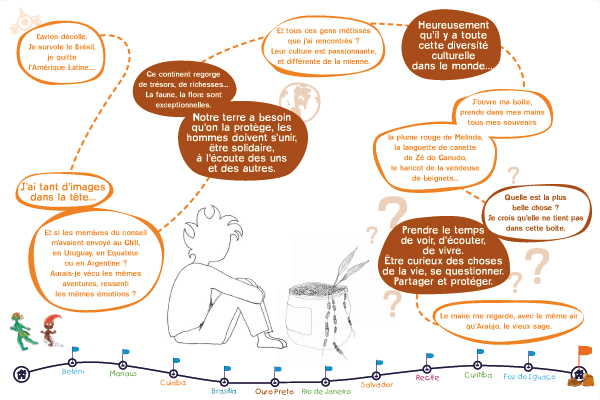Il s'agit d'une exposition pédagogique sur les thèmes du voyage et de l'altérité à destination du jeune public. Structurée par un conte original, elle retrace les découvertes d'un enfant nommé Léo, parti découvrir le continent latino-américain, en particulier le Brésil. Les deux parties amènent l'enfant à découvrir des singularités culturelles (panneaux "conte") puis à comprendre des problématiques inhérentes au continent (panneaux "problématiques"). Le contenu est conçu autour de deux axes : la société et l'environnement naturel du Brésil. Pour chacun, l'enfant est guidé par un personnage du folklore brésilien (respectivement le Saci et le Curupira) et des codes de couleurs (rouge et vert). Exploitation : cet outil s'explore de façon autonome ou accompagnée. Une feuille de route est disponible pour guider l'enfant dans l'exploitation des panneaux "contes" ; les panneaux "problématiques" peuvent être repris et approfondis par les médiateurs. Cette exposition permet aux enfants de tous niveaux de lecture de comprendre et de s'approprier le contenu des panneaux.