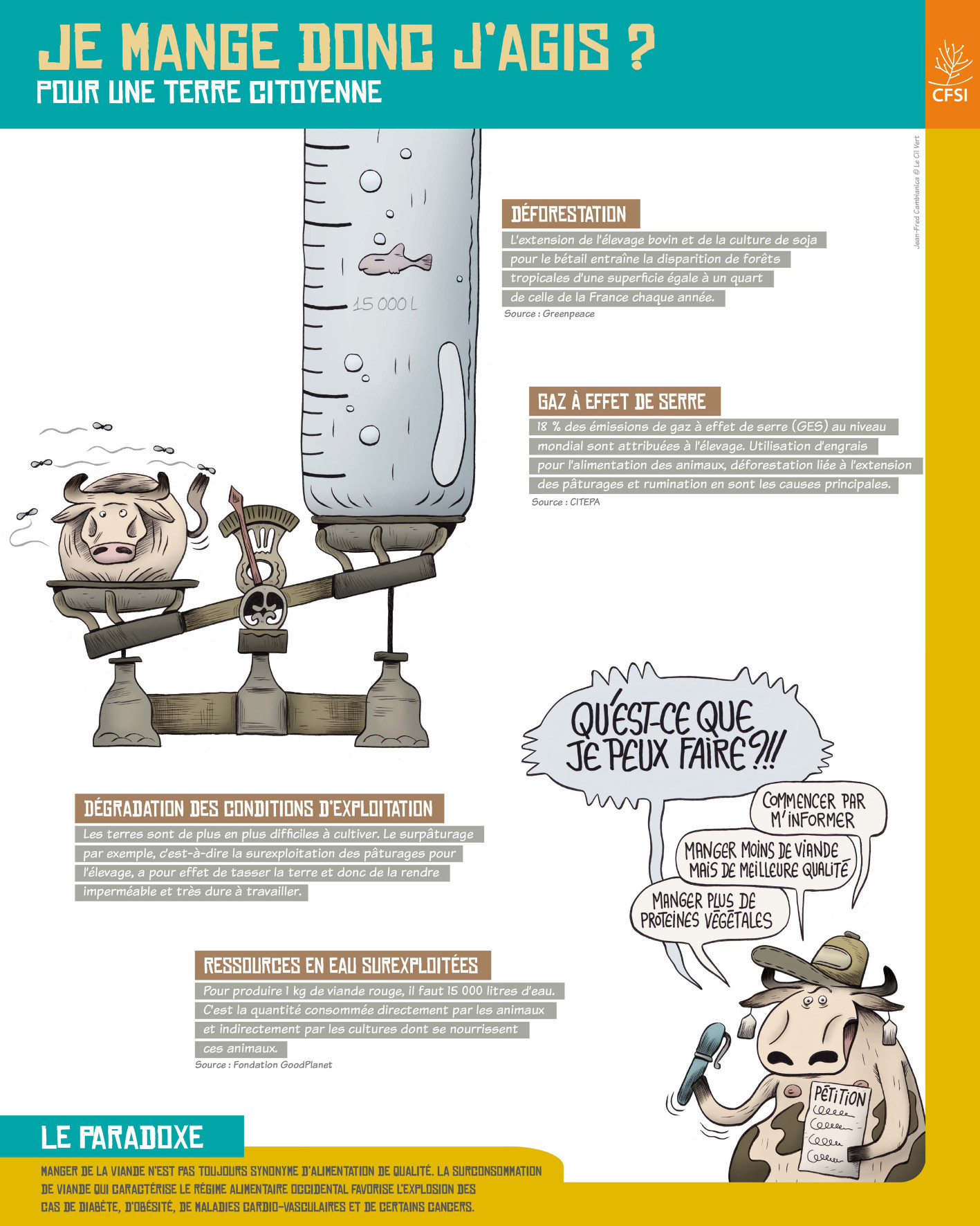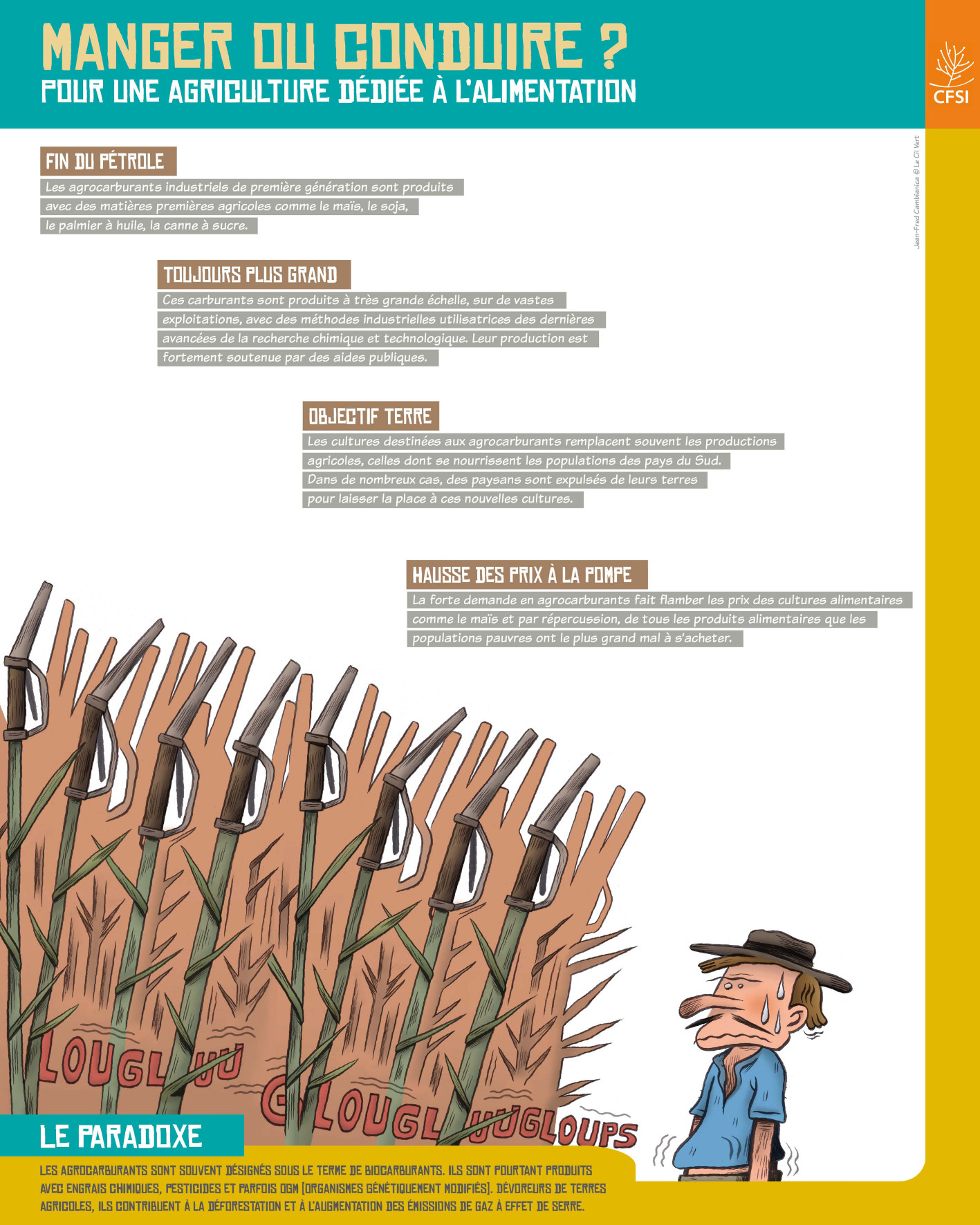 Ces 8 panneaux permettent de comprendre les causes de la faim dans le monde et donnent des pistes d’actions concrètes et durables pour l’éradiquer. Au fil de l’exposition, les visiteurs prennent connaissance des problématiques liées à l’agriculture et l’alimentation à travers plusieurs axes thématiques. Appuyés de questions et de paradoxes, sous forme d'encadrés, les panneaux invitent à analyser les incohérences du système alimentaire actuel et à juger des changements qui doivent être réalisés.