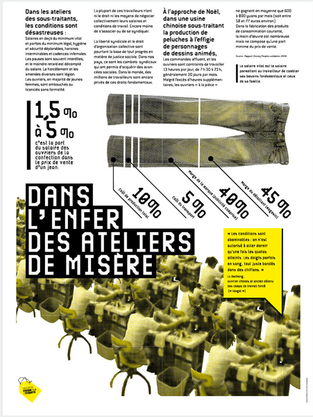 Le slogan de l'affiche est intitulé "mondialiser les droits humains au travail". Les plaquettes de présentation expliquent les conditions dans lesquelles sont fabriqués vêtements, chaussures de sport, jouets ainsi que la responsabilité des entreprises et l'information des consommateurs.