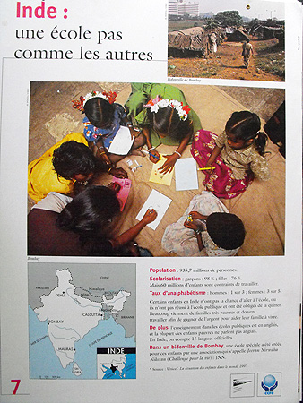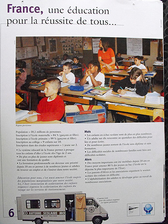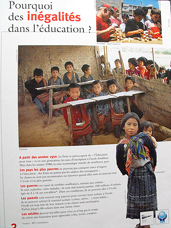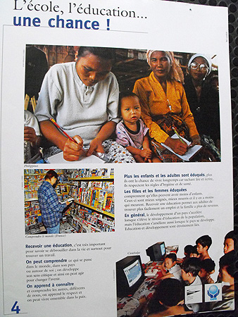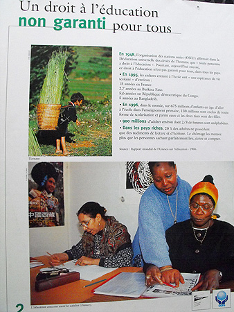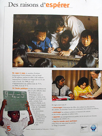 Cette exposition appréhende le problème de l'éducation pour tous d'une manière globale. Après une tentative de définition de l'éducation et l'affirmation que ce droit n'est pas garanti pour tous, l'exposition explique les causes de cette inégalité, avant d'affirmer l'importance de l'éducation, non seulement pour les individus, mais également pour les pays dans leur ensemble. Puis, la situation du système éducatif français est présentée. Enfin, deux exemples d'éducation adaptée en Inde et au Bénin sont détaillés. |