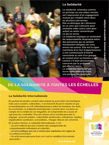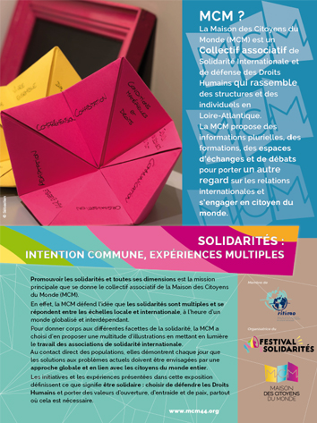 À travers cette exposition, le collectif associatif de la Maison des Citoyens du Monde (MCM) aborde la question des solidarités et montre la multiplicité des actions proposées par ses membres, au niveau local et international : soutenir les populations défavorisées ; défendre le droit des peuples et les droits humains (notamment en Palestine) ; promouvoir un développement local, solidaire et durable en France et à l'international ; sensibiliser au droit à la santé pour tou·tes ; éduquer à la citoyenneté et à la solidarité internationale ; promouvoir le commerce équitable.